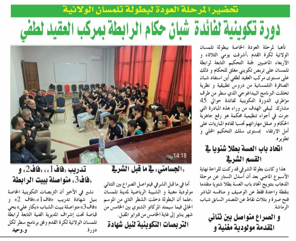 تحضيرا لمرحلة العودة للبطولة الولائية التلمسانية،لكرة القدم،2025-2026. أشرفت لجنة التحكيم لرابطة تلمسان لكرة القدم على تنظيم تربص تكويني مغلق ،دام يومي الثلاثاء والأربعاء 30-31 ديسمبر 2025 بالمركب الرياضي العقيد لطفي. وقد احتوى البرنامج البيداغوجي على دروس تطبيقية ونظرية، استفاد منها 45 حكما شابا من المشاركين. |