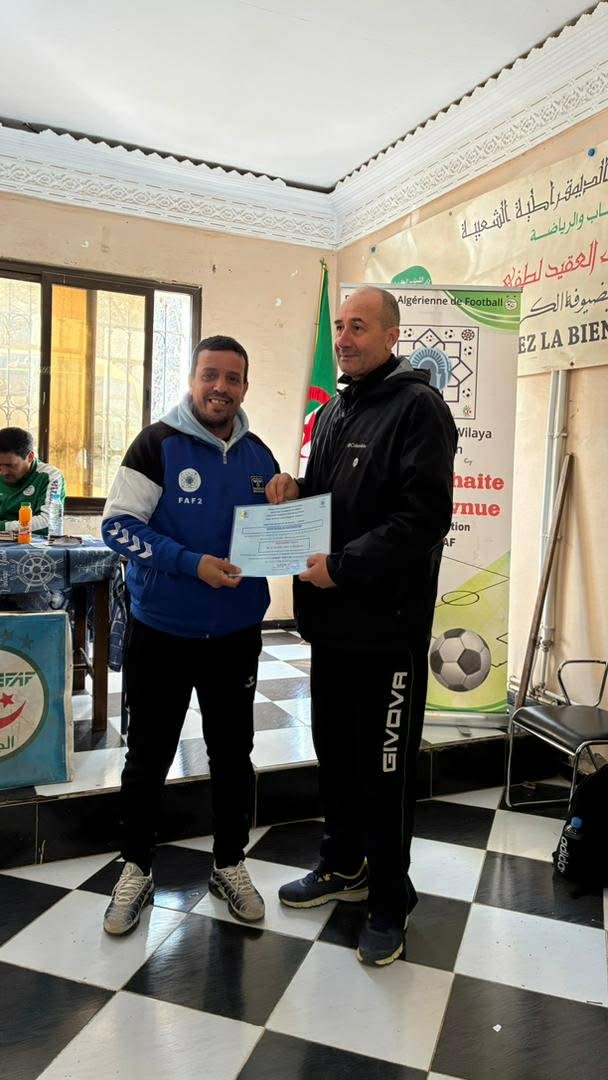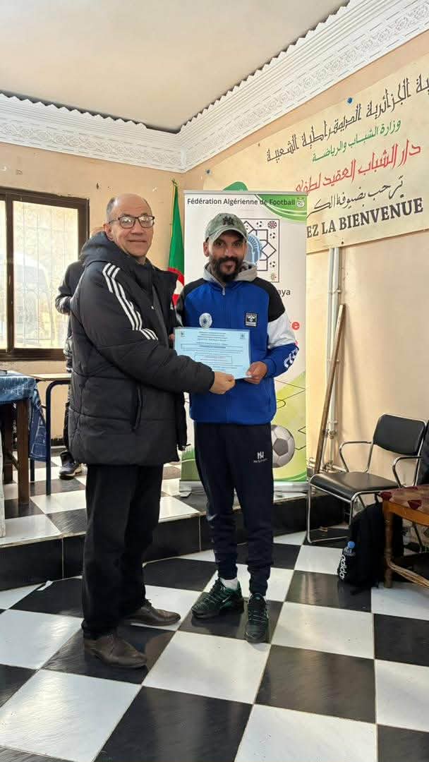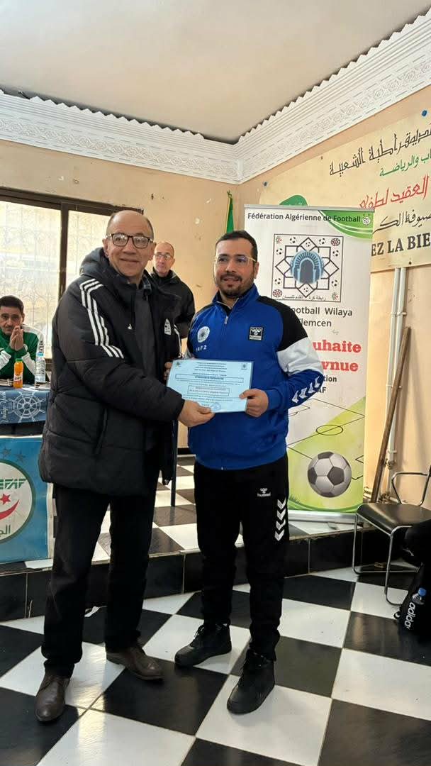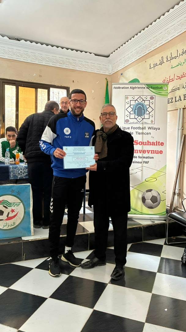 إختتاما لتربص المدربين لكرة القدم، فاف-2- التجمع الأول،أشرف مفتشو الشباب والرياضة لولاية تلمسان، وهم كل من السادة - عبد المالك محمد - العربي بن عبدالله . على حفل توزيع شهادة التربص. إحتضنت هذا الحفل قاعة الاجتماعات لمؤسسة مبيت الشباب بكار علي -قباسة،تلمسان- وقد أقيم من يوم السبت17،الى يوم 20يناير 2026. حيث تابع بإهتمام بالغ 30 متربصا مختلف المناهج التدريبة التطبيقية والنظرية، المقدمة من طرف المؤطرين الفدراليين تحت إشراف المديرية الفنية التلمسانية للرابطة الولائة لكرة القدم تلمسان. |